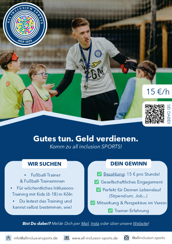All Inclusion Sports e.V. sucht engagierte Sportstudierende als Fußballtrainer:innen für ein wöchentliches inklusives Training mit Kindern und Jugendlichen (6–18 Jahre) in der Soccerworld Köln-Lövenich. Das Training findet dienstags von 16:30–17:30 Uhr statt und wird von dir eigenständig gestaltet. Du sammelst wertvolle Trainererfahrung, engagierst dich gesellschaftlich und erhältst eine Vergütung von 15 €/Stunde. Die Tätigkeit eignet sich hervorragend als Ehrenamt und wertet jeden Lebenslauf deutlich auf. Weitere Informationen unter: all-inclusion-sports.de; Kontakt: info@allinclusionsports.de oder +49 1512 3534804