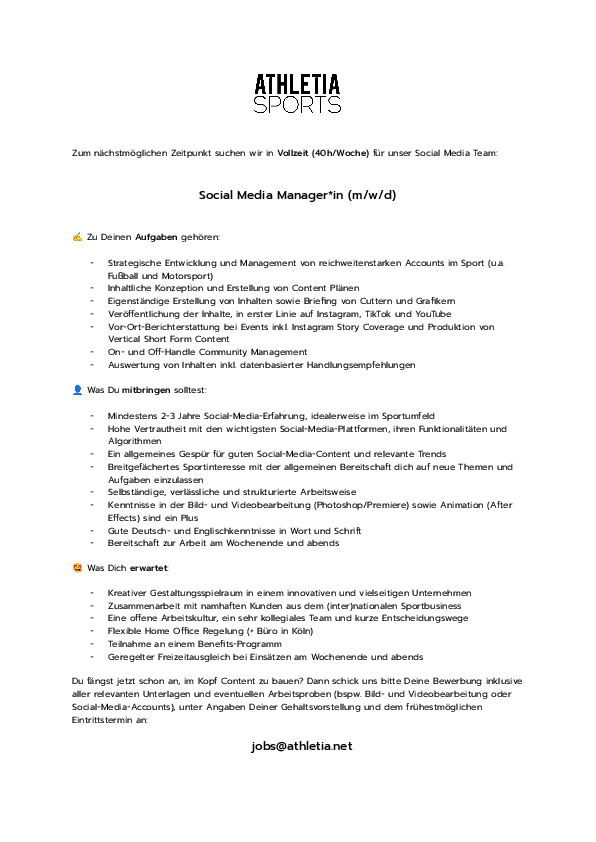 - Mindestens 2-3 Jahre Social-Media-Erfahrung, idealerweise im Sportumfeld