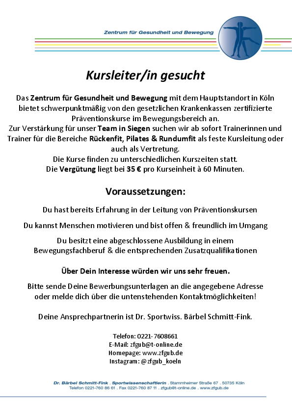 Das Zentrum für Gesundheit und Bewegung mit dem Hauptstandort in Köln bietet schwerpunktmäßig von den gesetzlichen Krankenkassen zertifizierte Präventionskurse im Bewegungsbereich an.