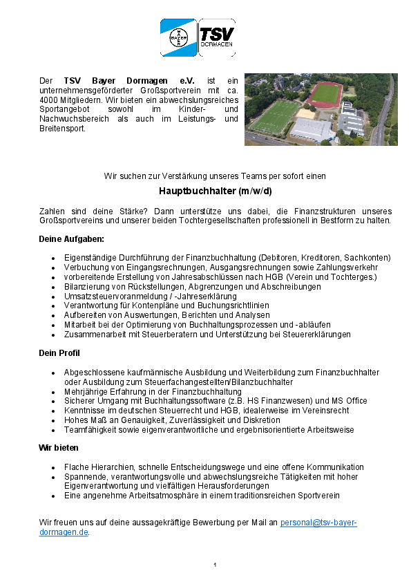 Wir freuen uns auf deine aussagekräftige Bewerbung per Mail an personal@tsv-bayer-dormagen.de.