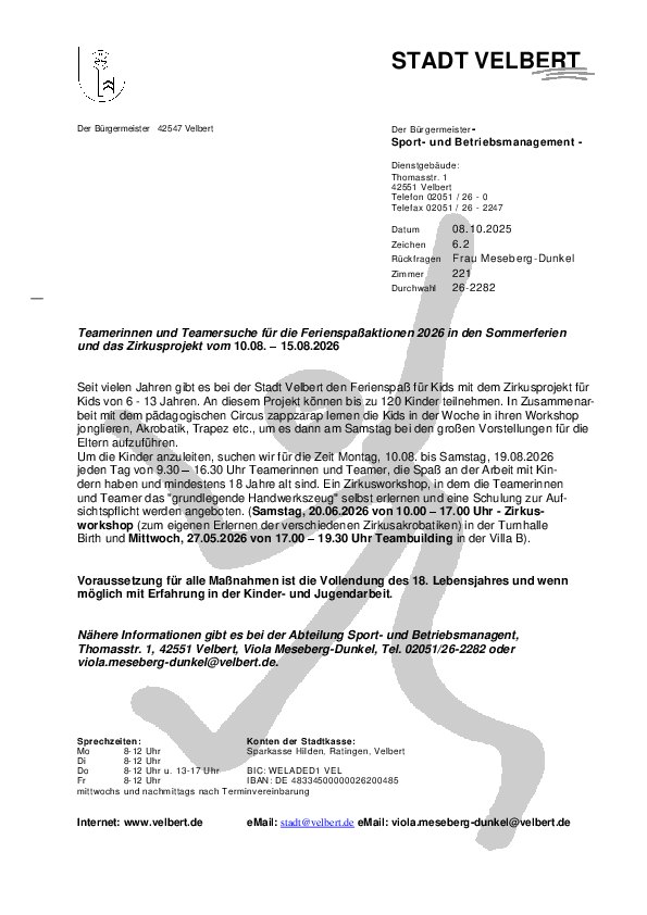 Nähere Informationen gibt es bei Stadt Velbert, Sport- und Betriebsmanagement, Viola Meseberg-Dunkel, viola.meseberg-dunkel@velbert.de oder +49 2051262282