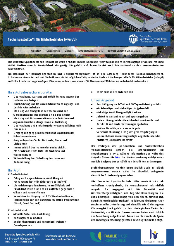 Im Dezernat für Bauangelegenheiten und Gebäudemanagement ist in der Abteilung Technisches Gebäudemanagement, Schwimmzentrum Betrieb und Technik zum nächstmöglichen Zeitpunkt eine Stelle als Fachangestellte*r für Bäderbetriebe (w/m/d) in Vollzeit mit einer regelmäßigen Wochenarbeitszeit von derzeit 38 Stunden und 50 Minuten unbefristet zu besetzen.