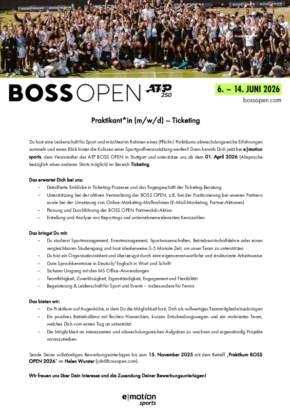 Du hast eine Leidenschaft für Sport und möchtest im Rahmen eines (Pflicht-) Praktikums abwechslungsreiche Erfahrungen sammeln und einen Blick hinter die Kulissen einer Sportgroßveranstaltung werfen? Dann bewirb Dich jetzt bei e|motion sports, dem Veranstalter der ATP BOSS OPEN in Stuttgart und unterstütze uns ab dem 01. April 2026 (Absprache bezüglich eines anderen Starts möglich) im Bereich Ticketing.