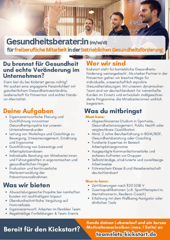 Wenn du Teil unseres Teams werden möchtest und deine Leidenschaft für Gesundheit und Wohlbefinden mit unseren Kunden teilen willst, dann bewirb dich jetzt! Sende deinen Lebenslauf und ein kurzes Anschreiben an team@lets-kickstart.de. Weitere Informationen findest du auf lets-kickstart.de