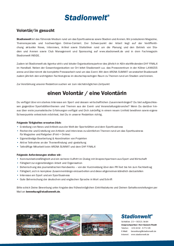 Themenspecials und hochwertigen Online-Content. Der Schwerpunkt der Arbeit liegt auf der Veröffentlichung aktueller News, Interviews, Artikel sowie Statistiken rund um die Planung und den Betrieb von Stadien und Arenen sowie Club Management und Sponsoring auf www.stadionwelt.de und in dem Fachmagazin