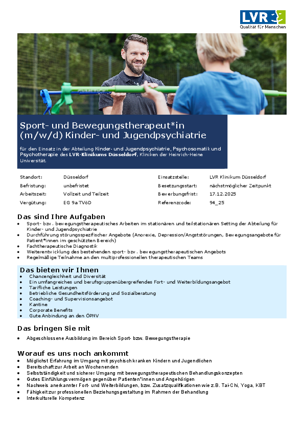 Sport- und Bewegungstherapeut*in (m/w/d) Kinder- und Jugendpsychiatrie