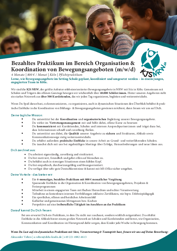 Wenn Du Spaß daran hast, mit Menschen zu kommunizieren, gerne organisierst, auch in dynamischen Situationen den Überblick behältst und praktische Einblicke in die Koordination von Bildungs- und Bewegungsangeboten gewinnen möchtest, dann freuen wir uns auf Dich.
