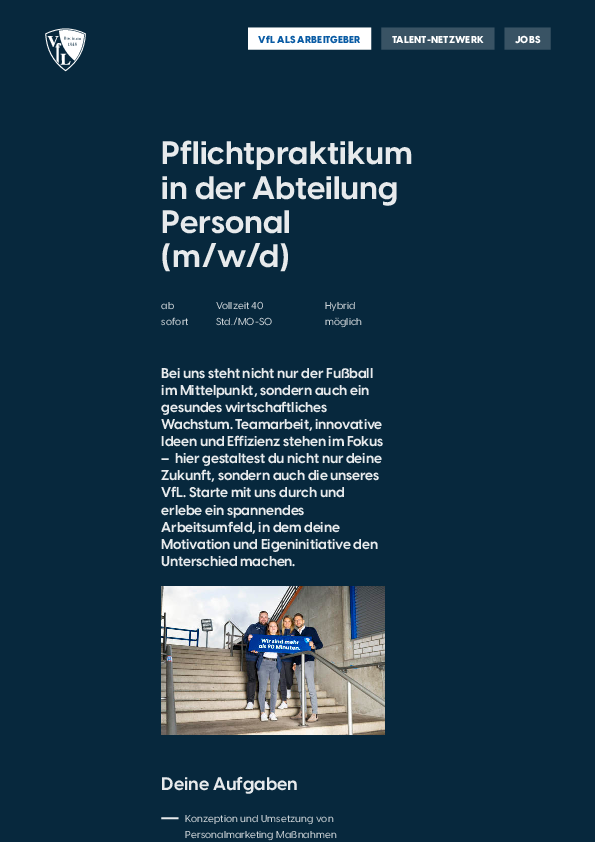 Ein besonderes Arbeitsumfeld: Der Fußball bringt Menschen zusammen, wirvermitteln Freude, Faszination, Nähe und Begeisterung. Deine Leidenschaft und Dynamik sind gefragt, deine Ideen erwünscht - für deine Entwicklung und den VfL von Morgen.