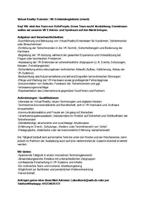 Hey! Wir sind das Team von XcitePeople. Unser Team sucht Verstärkung. Gemeinsam mit dir wollen wir unseren VR Erlebnis und Spiele Raum auf den Markt bringen.