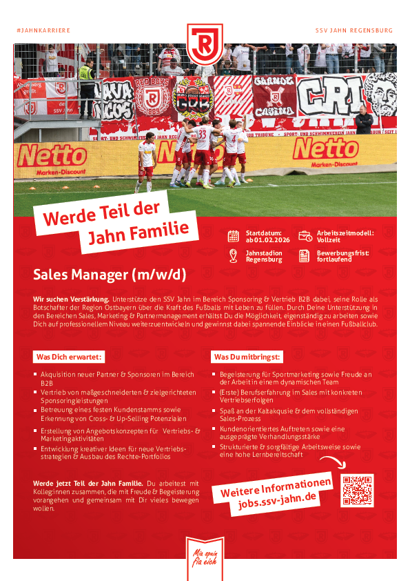 Wir suchen Verstärkung. Unterstütze den SSV Jahn im Bereich Sponsoring & Vertrieb B2B dabei, seine Rolle als Botschafter der Region Ostbayern über die Kraft des Fußballs mit Leben zu füllen. Durch Deine Unterstützung in den Bereichen Sales, Marketing & Partnermanagement erhältst Du die Möglichkeit, eigenständig zu arbeiten sowie Dich auf professionellem Niveau weiterzuentwickeln und gewinnst dabei spannende Einblicke in einen Fußballclub.