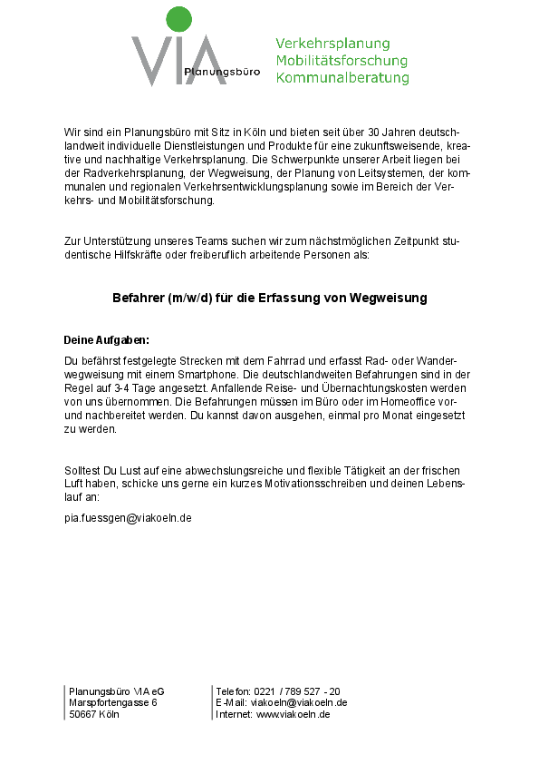 Zur Unterstützung unseres Teams suchen wir zum nächstmöglichen Zeitpunkt studentische Hilfskräfte oder freiberuflich arbeitende Personen als: Befahrer (m/w/d) für die Erfassung von Wegweisung. Deine Aufgaben: Du befährst festgelegte Strecken mit dem Fahrrad und erfasst Rad- oder Wanderwegweisung mit einem Smartphone. Die deutschlandweiten Befahrungen sind in der Regel auf 3-4 Tage angesetzt. Anfallende Reise- und Übernachtungskosten werden von uns übernommen. Die Befahrungen müssen im Büro oder im Homeoffice vor- und nachbereitet werden. Du kannst davon ausgehen, einmal pro Monat eingesetzt zu werden.