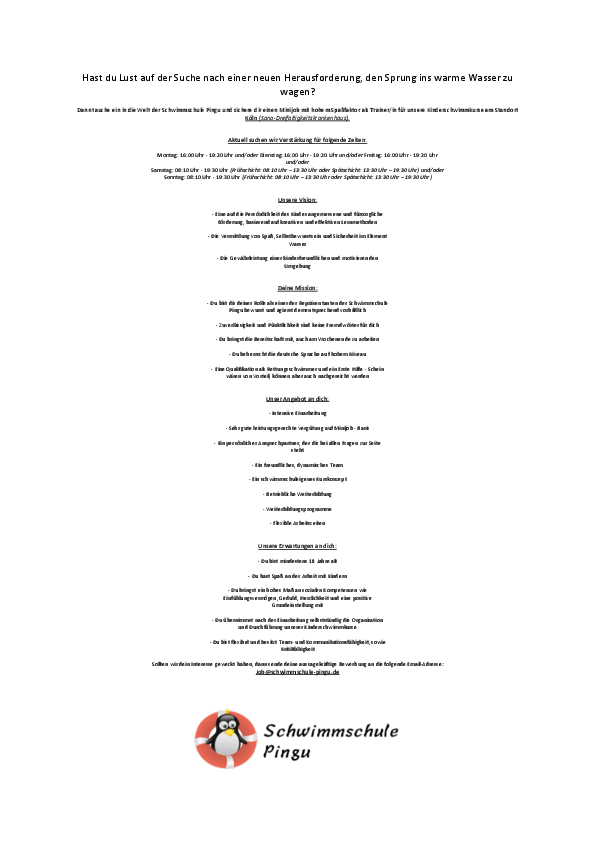 Dann tauche ein in die Welt der Schwimmschule Pingu und sichere dir einen Minijob mit hohem Spaßfaktor als Trainer/in für unsere Kinderschwimmkurse am Standort Köln (Sana-Dreifaltigkeitskrankenhaus).