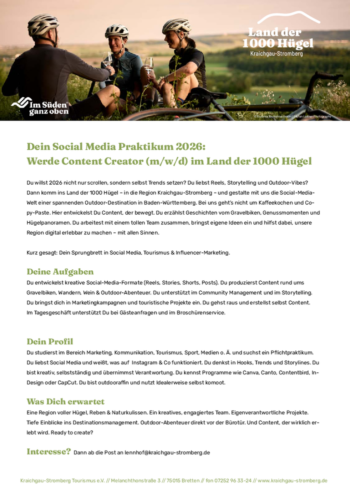 Dann komm ins Land der 1000 Hügel – in die Region Kraichgau-Stromberg – und gestalte mit uns die Social-MediaWelt einer spannenden Outdoor-Destination in Baden-Württemberg. Bei uns geht’s nicht um Kaffeekochen und Copy-Paste. Hier entwickelst Du Content, der bewegt. Du erzählst Geschichten vom Gravelbiken, Genussmomenten und
