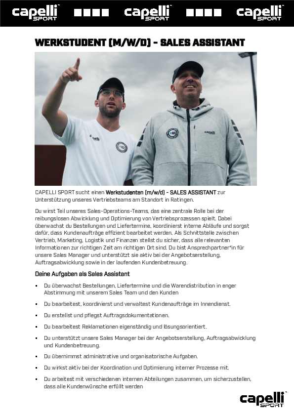CAPELLI SPORT sucht einen Werkstudenten (m/w/d) - SALES ASSISTANT zur Unterstützung unseres Vertriebsteams am Standort in Ratingen.