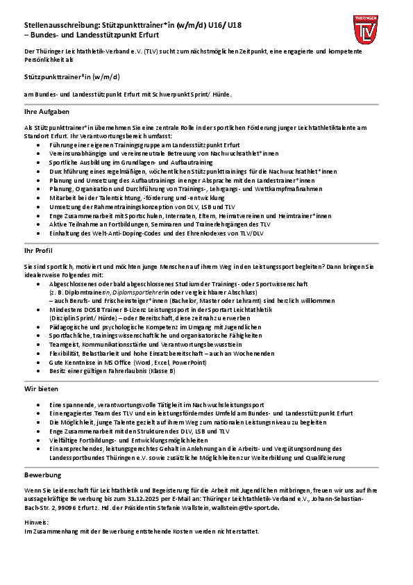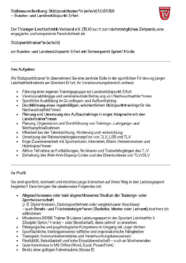 Der Thüringer Leichtathletik-Verband e.V. (TLV) sucht zum nächstmöglichen Zeitpunkt, eine engagierte und kompetente Persönlichkeit als Stützpunkttrainer*in (w/m/d)