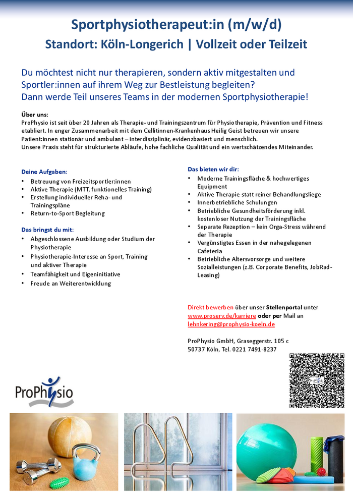 Direkt bewerben über unser Stellenportal unter www.proserv.de/karriere oder per Mail an lehnkering@prophysio-koeln.de