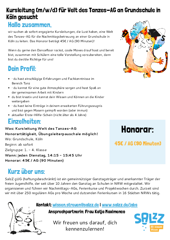 Wir suchen ab sofort engagierte Kursleitungen (m/w/d) für eine Welt des Tanzes-AG an einer Schule in Köln.