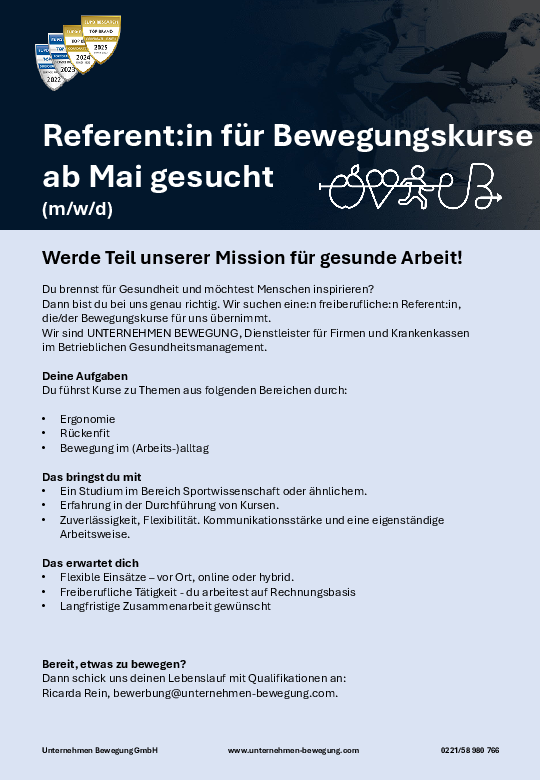 Wir suchen freiberufliche Referent:innen, die ab Mai Bewegungskurse für uns übernehmen. Alles Weitere in der Ausschreibung. Wir freuen uns auf eure Bewerbungen!