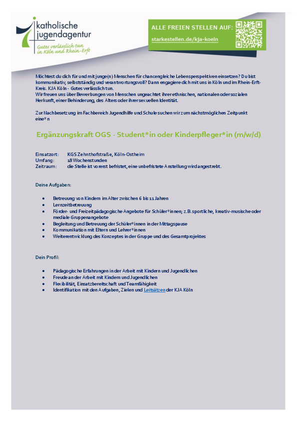 - Ergänzungskraft OGS, KGS Zehnthofstraße, Köln-Ostheim