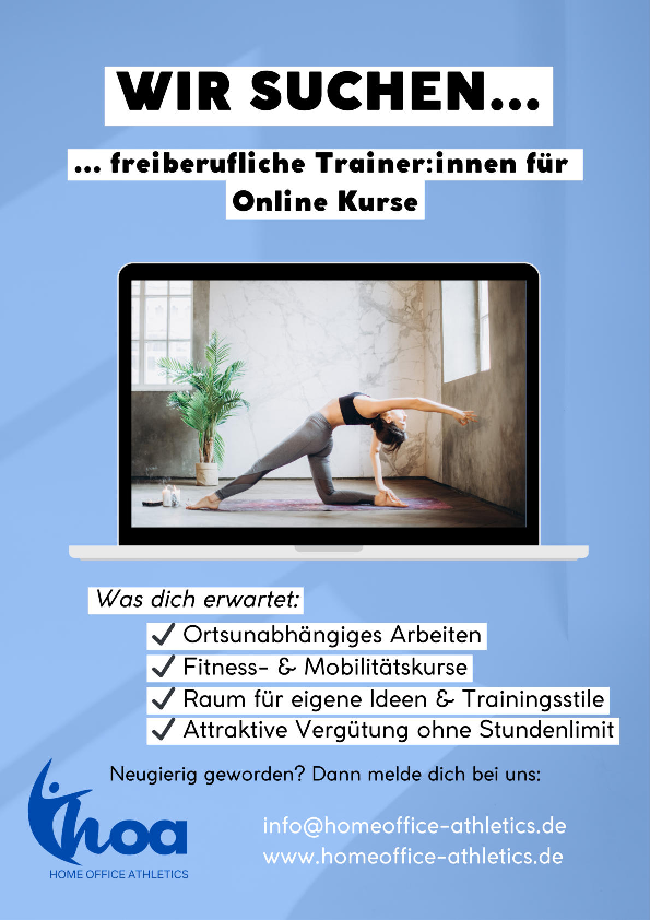 Home Office Athletics ist ein innovatives Unternehmen im Bereich betriebliche Gesundheitsförderung mit Fokus auf Online-Live-Trainings. Wir unterstützen Unternehmen dabei, Bewegung, Mobilität und Fitness nachhaltig in den Arbeitsalltag ihrer Mitarbeitenden zu integrieren.