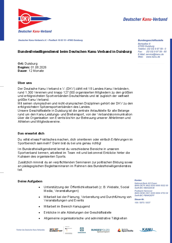 Bundesfreiwilligendienst (BFD) beim Deutschen Kanu-Verband (DKV) in Duisburg