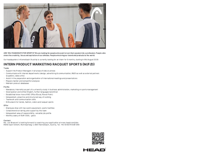 Ms. von Branconi is looking forward to receiving your application at www.head.com/jobs
