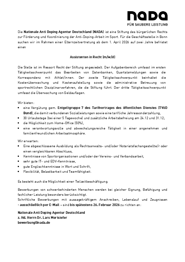 Die Stelle ist im Ressort Recht der Stiftung angesiedelt. Der Aufgabenbereich umfasst im ersten Tätigkeitsschwerpunkt das Bearbeiten von Datenbanken, Quartalsmeldungen sowie die Korrespondenz mit Athlet/innen. Der zweite Tätigkeitsschwerpunkt beinhaltet die Kostenüberwachung und Kostenaufstellung sowie die administrative Betreuung von sportrechtlichen Disziplinarverfahren, die die Stiftung führt. Der dritte Tätigkeitsschwerpunkt umfasst die Überwachung von Geldauflagen.