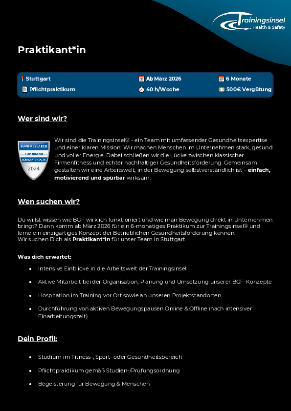 Du willst wissen wie BGF wirklich funktioniert und wie man Bewegung direkt in Unternehmen bringt? Dann komm ab März 2026 für ein 6-monatiges Praktikum zur Trainingsinsel® und lerne ein einzigartiges Konzept der etrieblichen Gesundheitsförderung kennen. Wir suchen Dich als Praktikant für unser Team in Stuttgart.