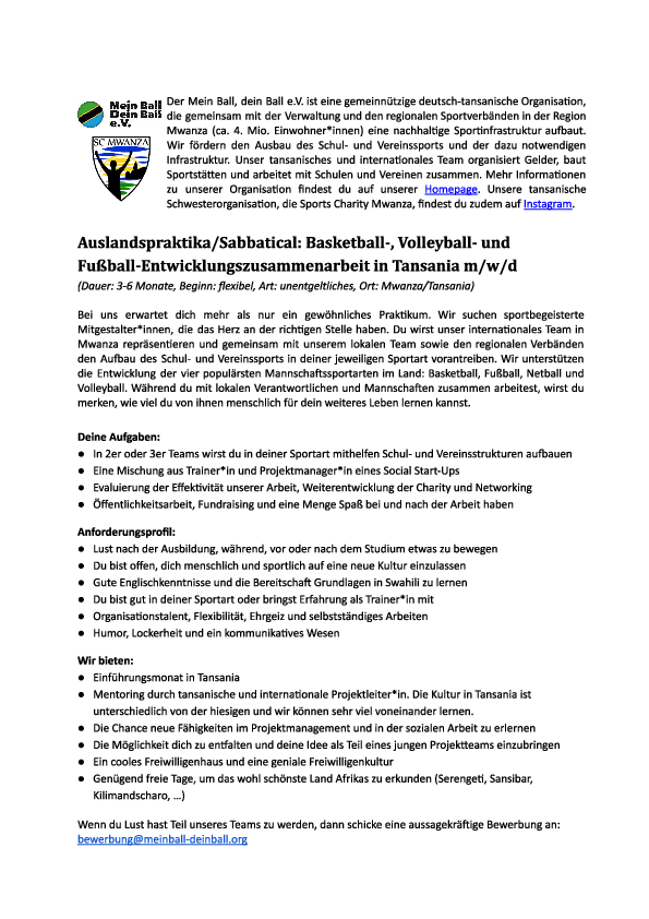 Dauer: 3-6 Monate, Beginn: flexibel, Art: unentgeltliches, Ort: Mwanza/Tansania | Deine aussagekräftige Bewerbung schickst du an: bewerbung@meinball-deinball.org
