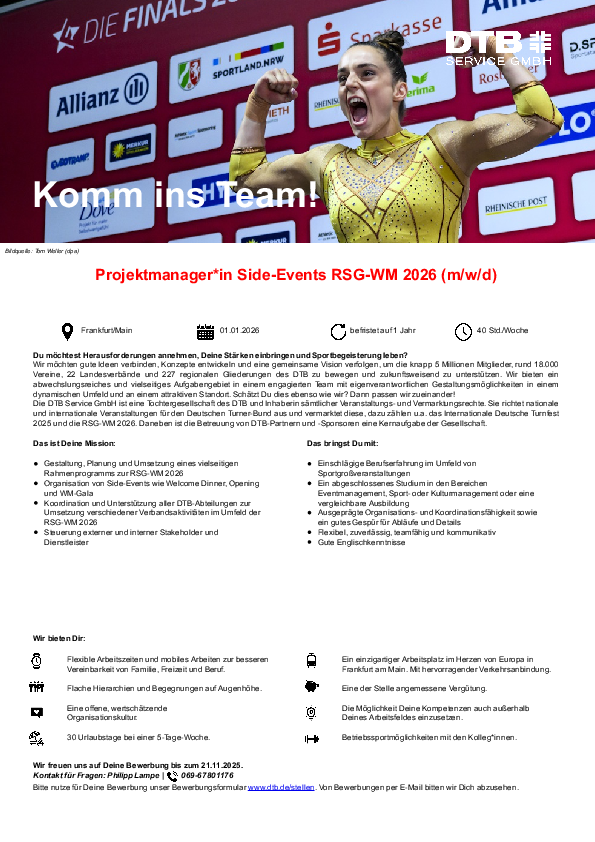 Bitte nutze für Deine Bewerbung unser Bewerbungsformular www.dtb.de/stellen. Von Bewerbungen per E-Mail bitten wir Dich abzusehen.