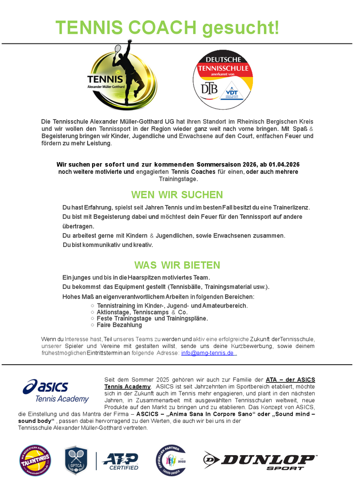 Wir suchen per sofort und zur kommenden Sommersaison 2026, ab 01.04.2026 noch weitere motivierte und engagierten Tennis Coaches für einen, oder auch mehrere Trainingstage.