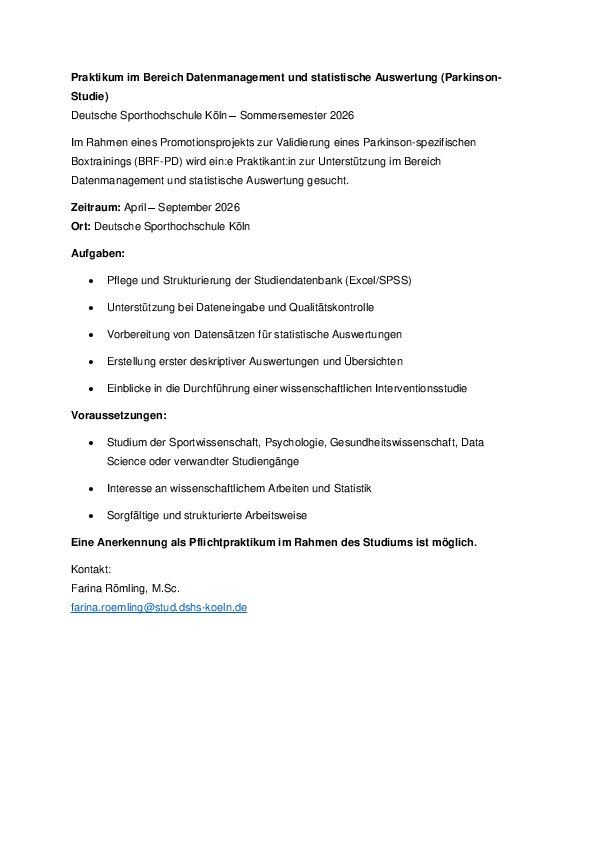Praktikum im Bereich Datenmanagement und statistische Analyseassistenz (wissenschaftliche Studie) – Sommersemester 2026