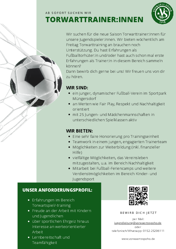 Wir suchen für die neue Saison Torwarttrainer:innen für unsere Jugendspieler. Wir bieten wöchentlich am Freitag Torwarttraining an brauchen noch Unterstützung. Du hast Erfahrungen als Fußballtorhüter:in und/oder hast auch schon mal erste Erfahrungen als Trainer:in in diesem Bereich sammeln können? Dann bewirb dich gerne bei uns! Wir freuen uns von dir zu hören.