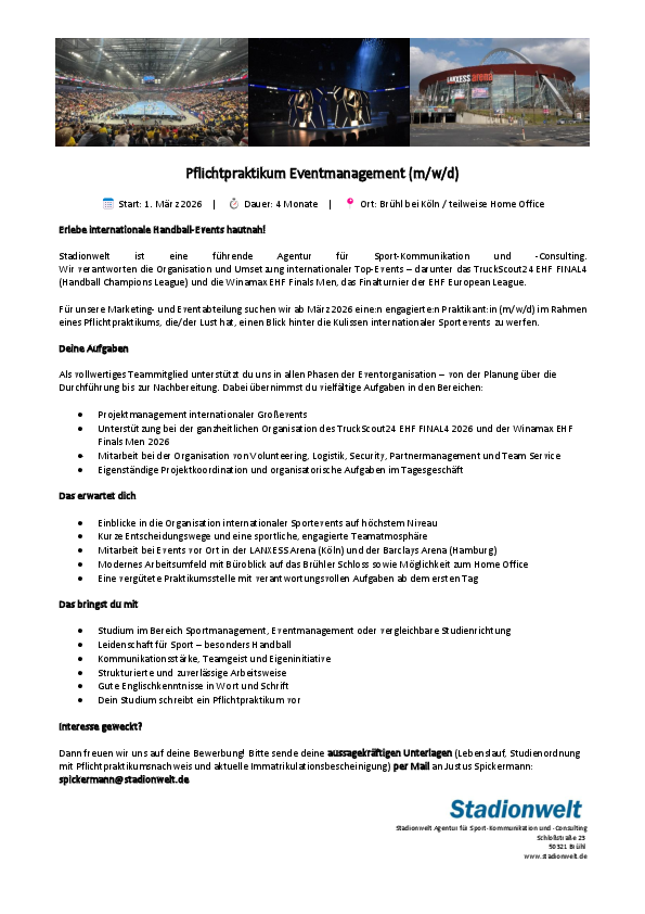 Dann freuen wir uns auf deine Bewerbung! Bitte sende deine aussagekräftigen Unterlagen (Lebenslauf, Studienordnung mit Pflichtpraktikumsnachweis und aktuelle Immatrikulationsbescheinigung) per Mail an Justus Spickermann: spickermann@stadionwelt.de
