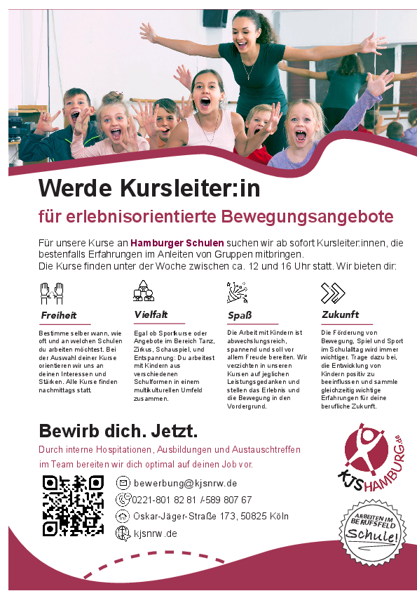 Egal ob Sportkurse oder Angebote im Bereich Fußball, Ballsport, Tanz, Zirkus, Schauspiel, Entspannung und Erlebnispädagogik: Du arbeitest mit Kindern aus verschiedenen Schulformen, in einem multikulturellen Umfeld zusammen.