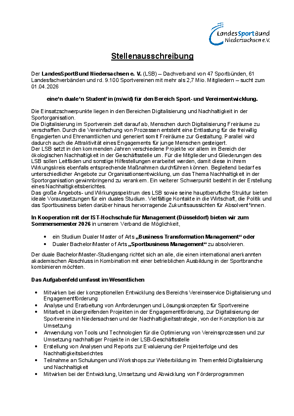 Ihre Bewerbung richten Sie bitte bis zum 11.01.2026 unter Angabe des Studiengangs über unser Karriereportal 8140998927.karriereportal.cloud/job/1052-eine*n-duale*n-Student*in-(m_w_d)-f%C3%BCr-den-Bereich-Sport--und-Vereinsentwicklung an den stv. Vorstandsvorsitzenden des LandesSportBund Niedersachsen e. V., Herrn Marco Lutz.