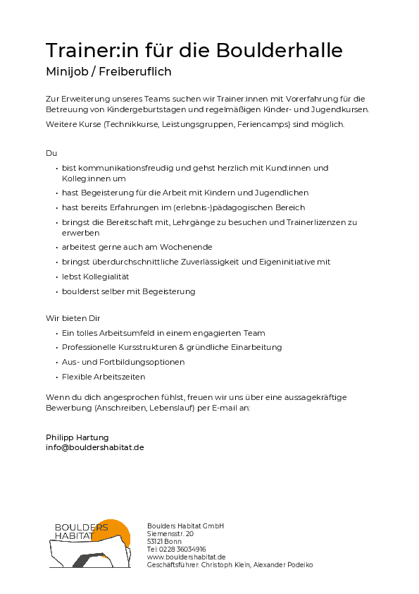 Zur Erweiterung unseres Teams suchen wir Trainer:innen mit Vorerfahrung für die Betreuung von Kindergeburtstagen und regelmäßigen Kinder- und Jugendkursen.