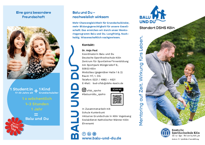 Mit Beginn der Vorlesungszeit im Sommersemester 2026 startet an der Sporthochschule wieder das Programm Balu und Du! Junge Erwachsene zwischen 17 und 30 Jahren begleiten Grundschulkinder in ihrer Freizeit. An der Sporthochschule wird hierbei ein Schwerpunkt gesetzt auf Bewegung, Spiel und Sport. Das übergeordnete Ziel bleibt jedoch unverändert: Kinder aus sozial(-ökonomisch) herausfordernden Lebensumständen in ihrer persönlichen Entwicklung stärken und so zu einer besseren Zukunftsperspektive für ihr Leben verhelfen!