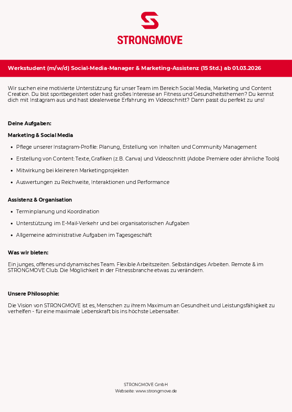 Ein junges, offenes und dynamisches Team. Flexible Arbeitszeiten. Selbständiges Arbeiten. Remote & im STRONGMOVE Club. Die Möglichkeit in der Fitnessbranche etwas zu verändern.