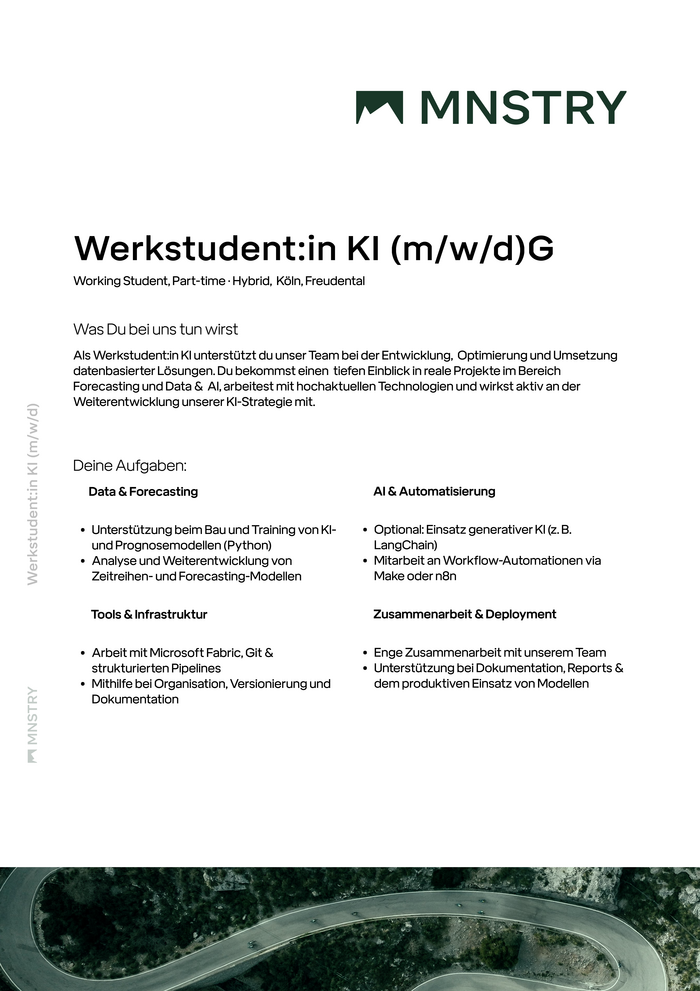 Als Werkstudent:in KI unterstützt du unser Team bei der Entwicklung, Optimierung und Umsetzung datenbasierter Lösungen. Du bekommst einen tiefen Einblick in reale Projekte im Bereich Forecasting und Data & AI, arbeitest mit hochaktuellen Technologien und wirkst aktiv an der Weiterentwicklung unserer KI-Strategie mit.