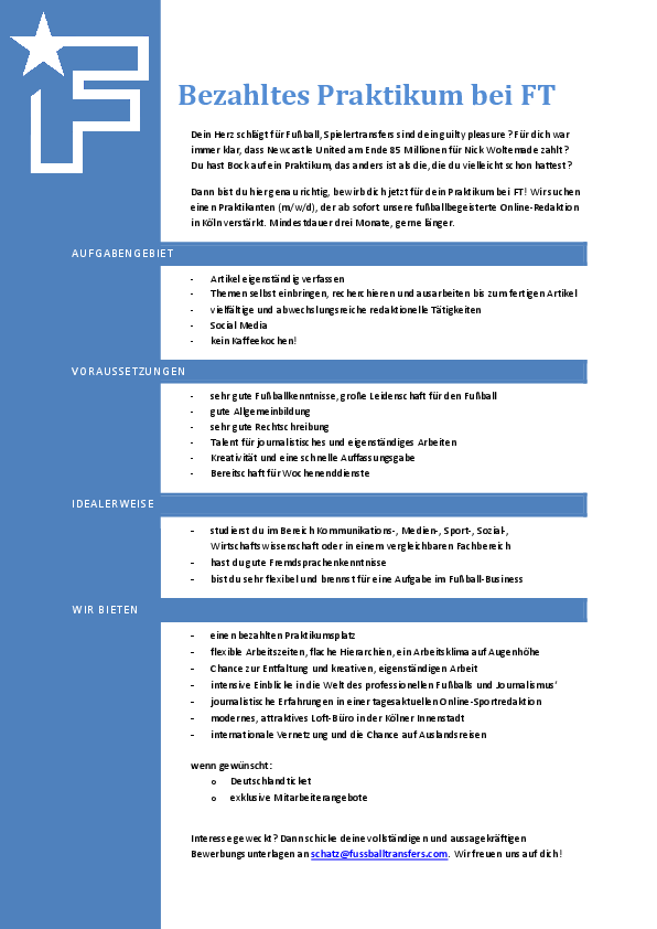 Dann bist du hier genau richtig, bewirb dich jetzt für dein Praktikum bei FT! Wir suchen einen Praktikanten (m/w/d), der ab sofort unsere fußballbegeisterte Online-Redaktion in Köln verstärkt. Mindestdauer drei Monate, gerne länger.