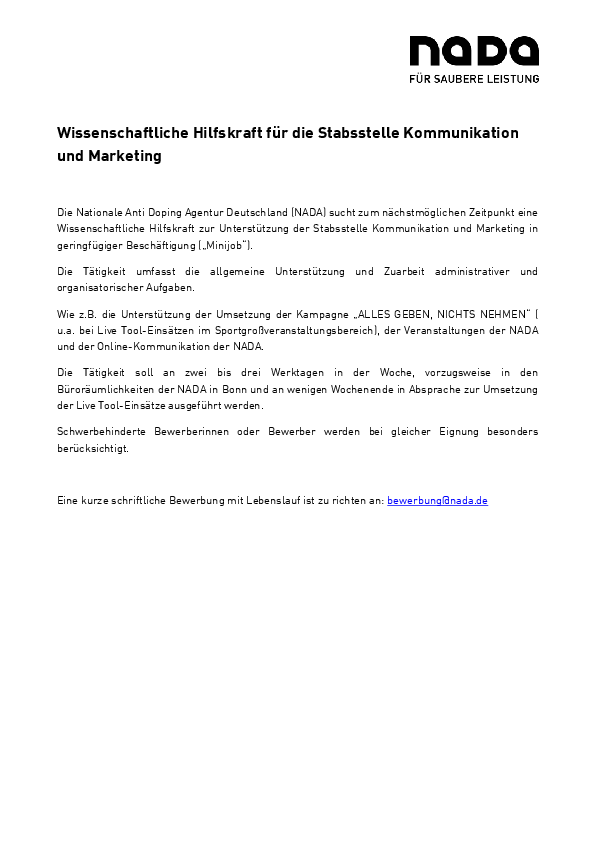 Die Nationale Anti Doping Agentur Deutschland (NADA) sucht zum nächstmöglichen Zeitpunkt eine Wissenschaftliche Hilfskraft zur