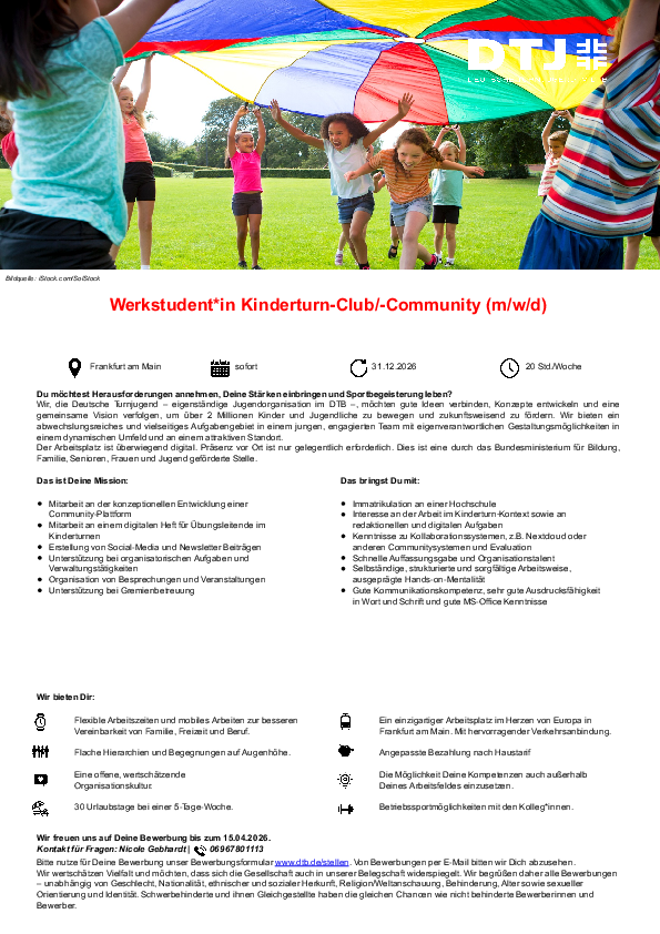 Gesucht wird eine Werkstudent*in (m/w/d) für den Kinderturn-Club und die Kinderturn-Community bei der Deutsche Turnjugend in Frankfurt am Main (überwiegend digitales Arbeiten, 20 Std./Woche, Start ab sofort, befristet bis 31.12.2026):
