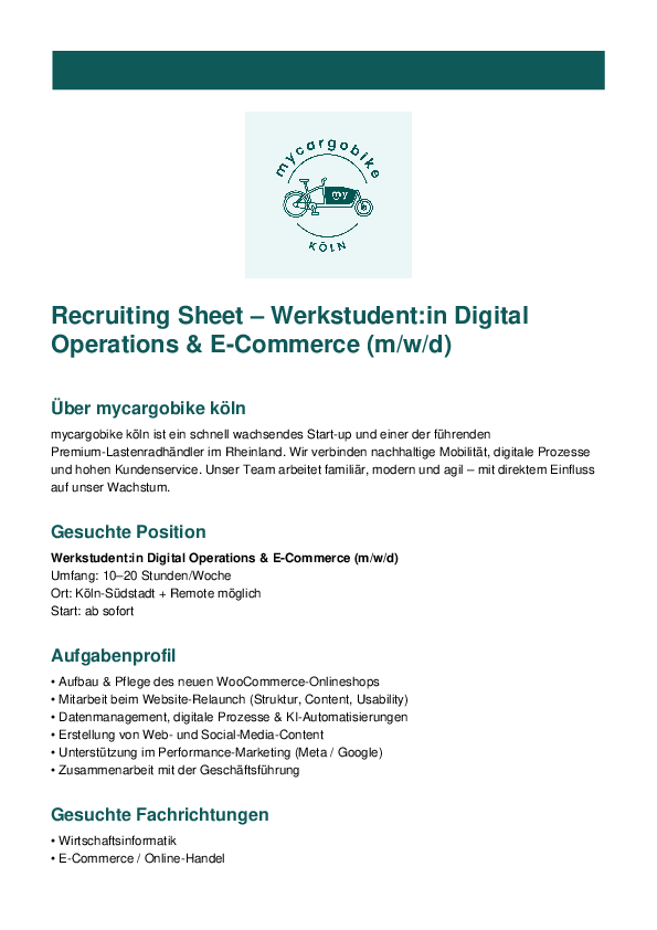 Wir sind mycargobike köln – ein junges, stark wachsendes Start-up, mit Sitz direkt auf der Severinstraße. Wir sind bereits einer der führenden Premium-Lastenradhändler in Köln und im Rheinland. Das gilt es auszubauen. Wir leben nachhaltige Mobilität und verbinden Bike-Leidenschaft mit echtem Kundenservice. In unserem Team herrscht eine familiäre Atmosphäre, in der jede Idee zählt. Du kannst uns beim Wachstum helfen und Cross-Disziplinär lernen. Wir starten gerade einige Projekte. Sei dabei!