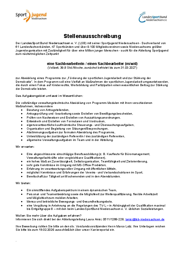 Ihre Bewerbung richten Sie bitte an den stv. Vorstandsvorsitzenden Herrn Marco Lutz. Ihre Unterlagen reichen Sie bitte bis zum 19.02.2026 ausschließlich über unser Karriereportal 8140998927.karriereportal.cloud/job/1054-Sachbearbeiterin-_-Sachbearbeiter-(m_w_d)-f%C3%BCr-die-Abteilung-Sportjugend ein.