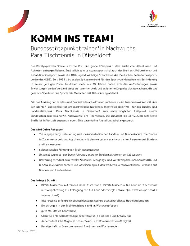Für das Training der Landes- und Bundeskaderathlet*innen suchen wir – im Zusammenwirken mit dem Behinderten- und Rehabilitationssportverband Nordrhein-Westfalen (BRSNW) – für den Bundes- und Landesstützpunkt Para Tischtennis in Düsseldorf zum nächstmöglichen Zeitpunkt eine*n Bundesstützpunkttrainer*in Nachwuchs Para Tischtennis. Die zunächst bis 31.12.2028 befristete Stelle ist in Vollzeit ausgeschrieben. Eine dauerhafte Anstellung wird angestrebt.
