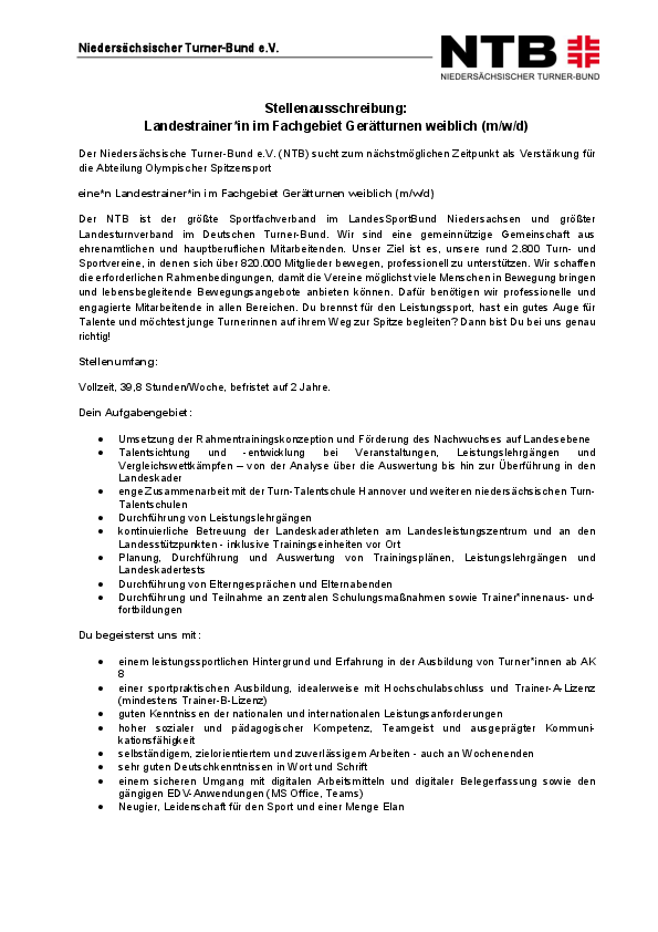 Der Niedersächsische Turner-Bund e.V. (NTB) sucht zum nächstmöglichen Zeitpunkt als Verstärkung für die Abteilung Olympischer Spitzensport