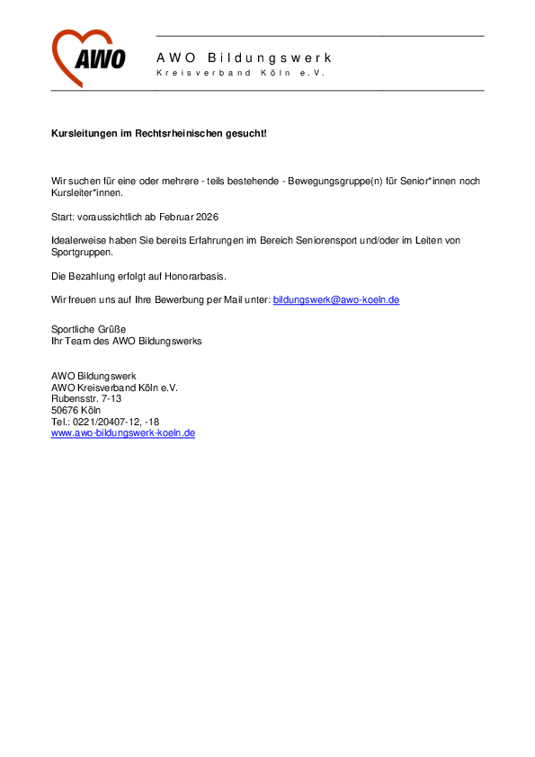 Wir freuen uns auf Ihre Bewerbung per Mail unter: bildungswerk@awo-koeln.de