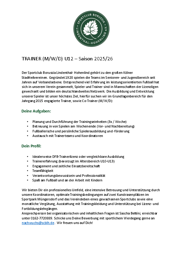 •Trainererfahrung (bevorzugt im Altersbereich U10-U13)