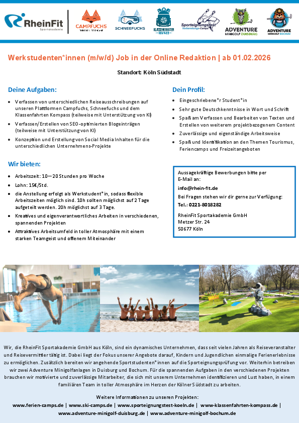 Die Tätigkeitsfelder der RheinFit Sportakademie liegen in den Bereichen Sport, Tourismus und Freizeit. Mit unseren Projekten - den Sporteignungstest Vorbereitungscamps, dem Campfuchs, dem Schneefuchs, dem Klassenfahrten Kompass und unseren beiden Adventure Minigolf Anlagen in Duisburg und Bochum - sind wir ein dynamisches Unternehmen im Bereich des Tourismus und von Freizeitstätten. Wir suchen für unser Büro im Herzen der Kölner Südstadt ab Februar 2026 eine*n Werkstudent*in, der/die unser Team tatkräftig im Bereich der Online Redaktion unterstützt und Lust auf viele neue Erfahrungen hat. Alle weiteren Infos findest du im pdf-Dokument. Wir freuen uns auf dich!